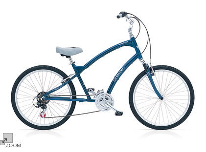 By mixing the comfortable laid-back seating position of the odd, but fast recumbent with their smart and swoopy curved cruisers, Electra created the next generation of bikes, the Townies. The Townie 21 is an exciting and economical choice for the customer who needs more gears than the internally-geared Townies offer, and doesn't want to empty their pocketbook. With a 21-speed Shimano Tourney drivetrain and Shimano's ultra-convenient twist-shifting system, the Townie 21 will take you wherever you want to go, in comfort. Available as Men's or Women's frame.